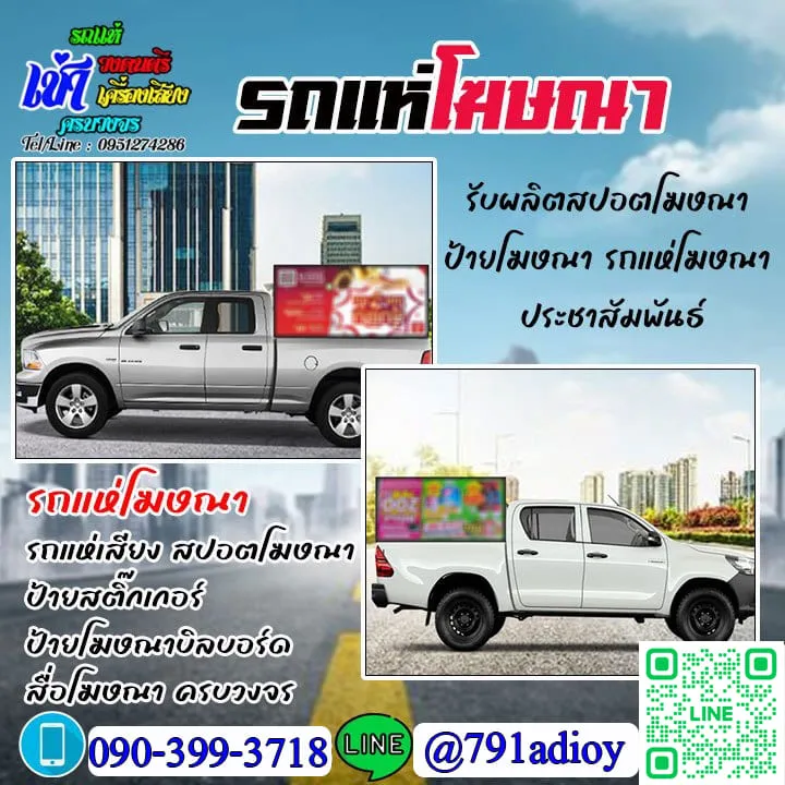 เราคือผู้ให้บริการ รถแห่โฆษณา..... สื่อโฆษณาทุกรูปแบบให้บริการ รถแห่โฆษณา ป้ายโฆษณา โฆษณาไวนิล เสียงสปอร์ตโฆษณาให้บริการในพื้นที่..... ตรงจุด ตรงเป้าหมาย เพิ่มยอดขายเพิ่มการรับรู้แบรนด์ แจ้งข่าวต่างๆ กระตุ้นมูลค่าทางธุรกิจ ตรงกลุ่มเป้าหมาย